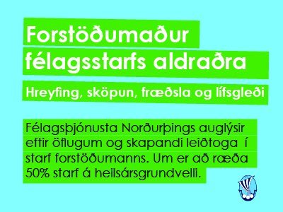 Um nýtt starf er að ræða sem krefst stefnumótunar og frumkvæðis. Félag eldri borgara hefur verið með öflugt félagsstaf og mun félagsstarfið á vegum Norðurþings vera í samstarfi við félagið.