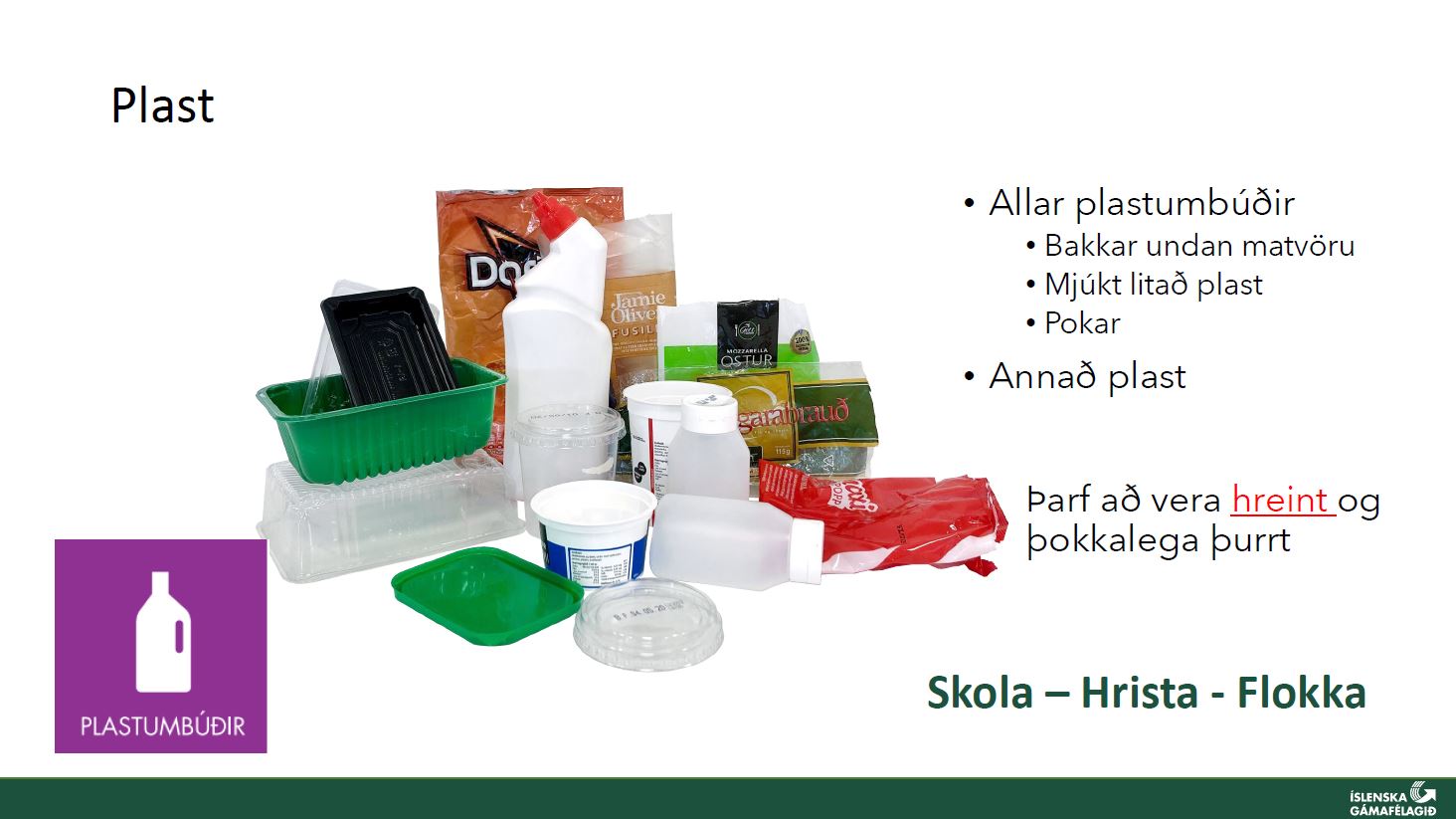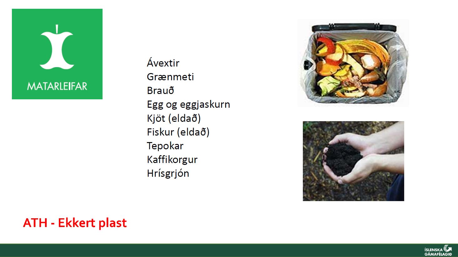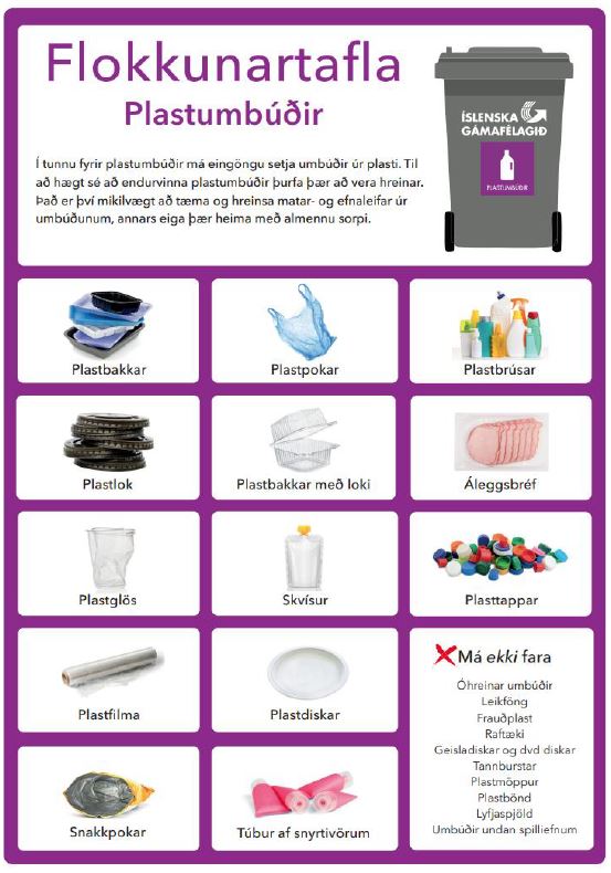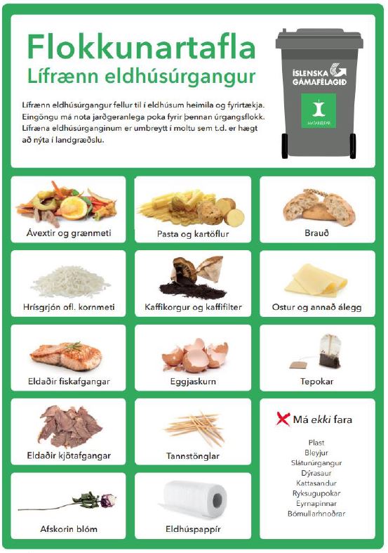 - Að taka allan lífrænan úrgang úr umbúðum áður en hann fer í tunnuna. Lífrænum úrgangi er umbreytt í moltu og t.d. nýttur í landgræðslu og því mikilvægt að umbúðir úr plasti, gleri eða járni fari ekki með.