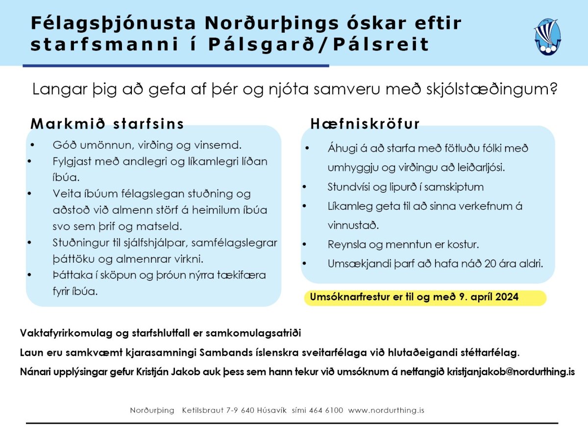 Nánari upplýsingar gefur Kristján Jakob auk þess sem hann tekur við umsóknum á netfangið kristjanjakob@nordurthing.is