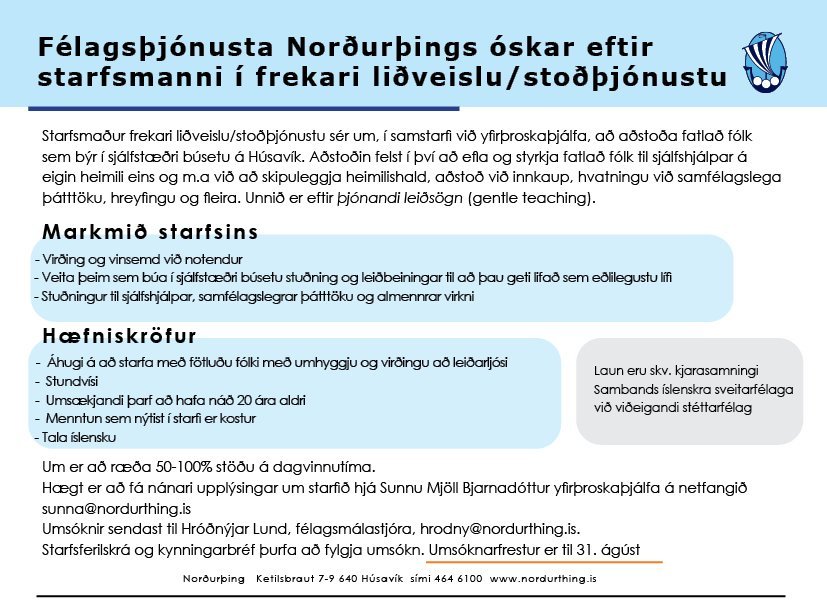 Félagsþjónusta Norðurþings óskar eftir starfsmanni til að sinna frekari liðveislu/stoðþjónustu.