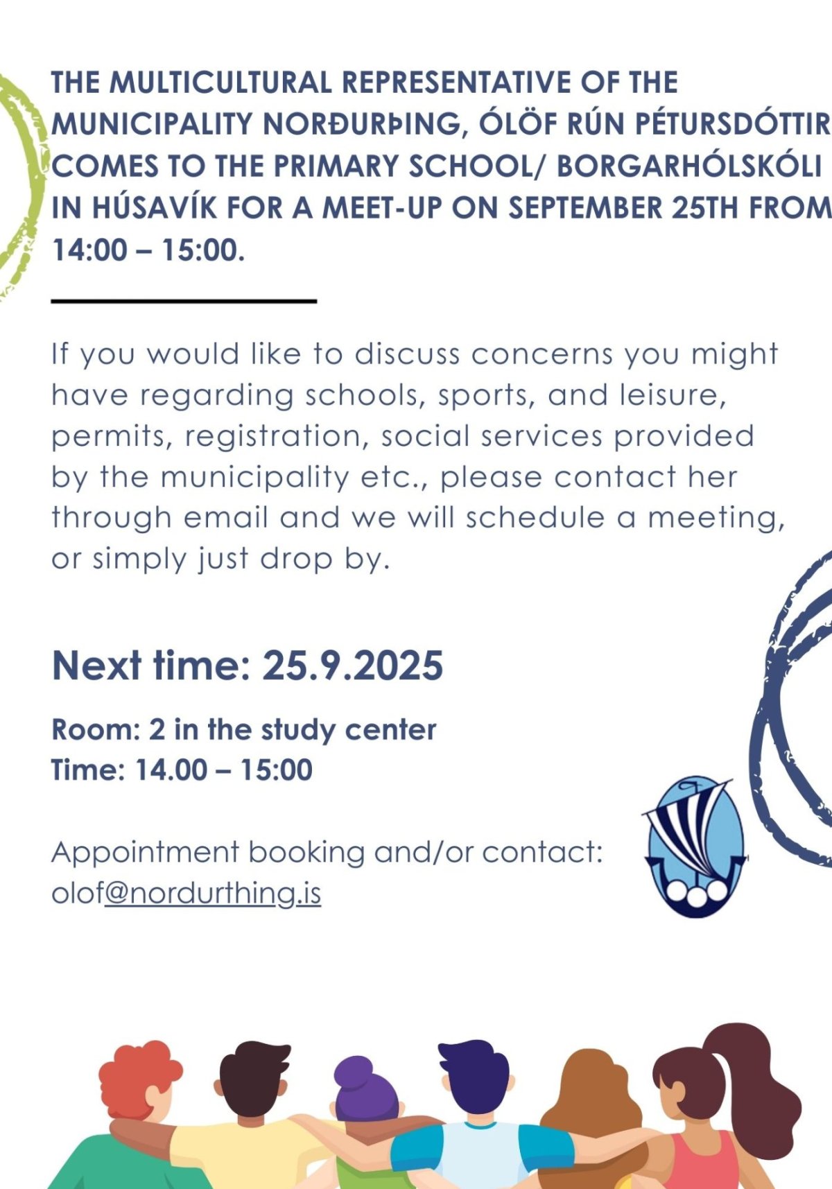 The multicultural representative of the municipality Norðurþing, Ólöf Rún Pétursdóttir, comes to the primary school/ Borgarhólskóli in Húsavík for a meet-up on September 25th from 14:00 – 15:00.