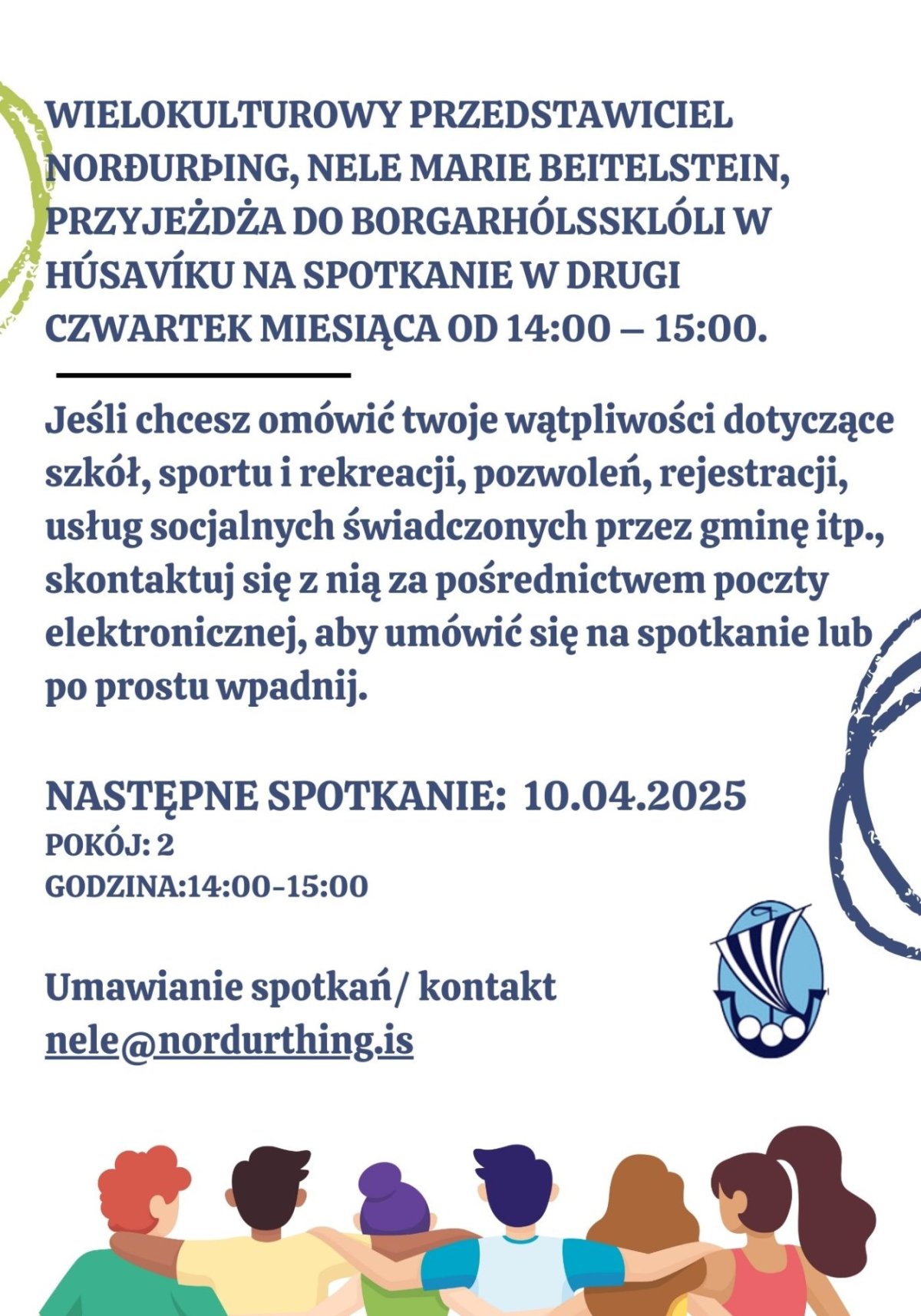 Fjölmenningarfulltrúi sveitarfélagsins Norðurþings, Nele Marie Beitelstein, mætir í Grunnskólann/ Borgarhólskóla á Húsavík til fundar annan fimmtudag í mánuði frá 14:00 – 15:00.