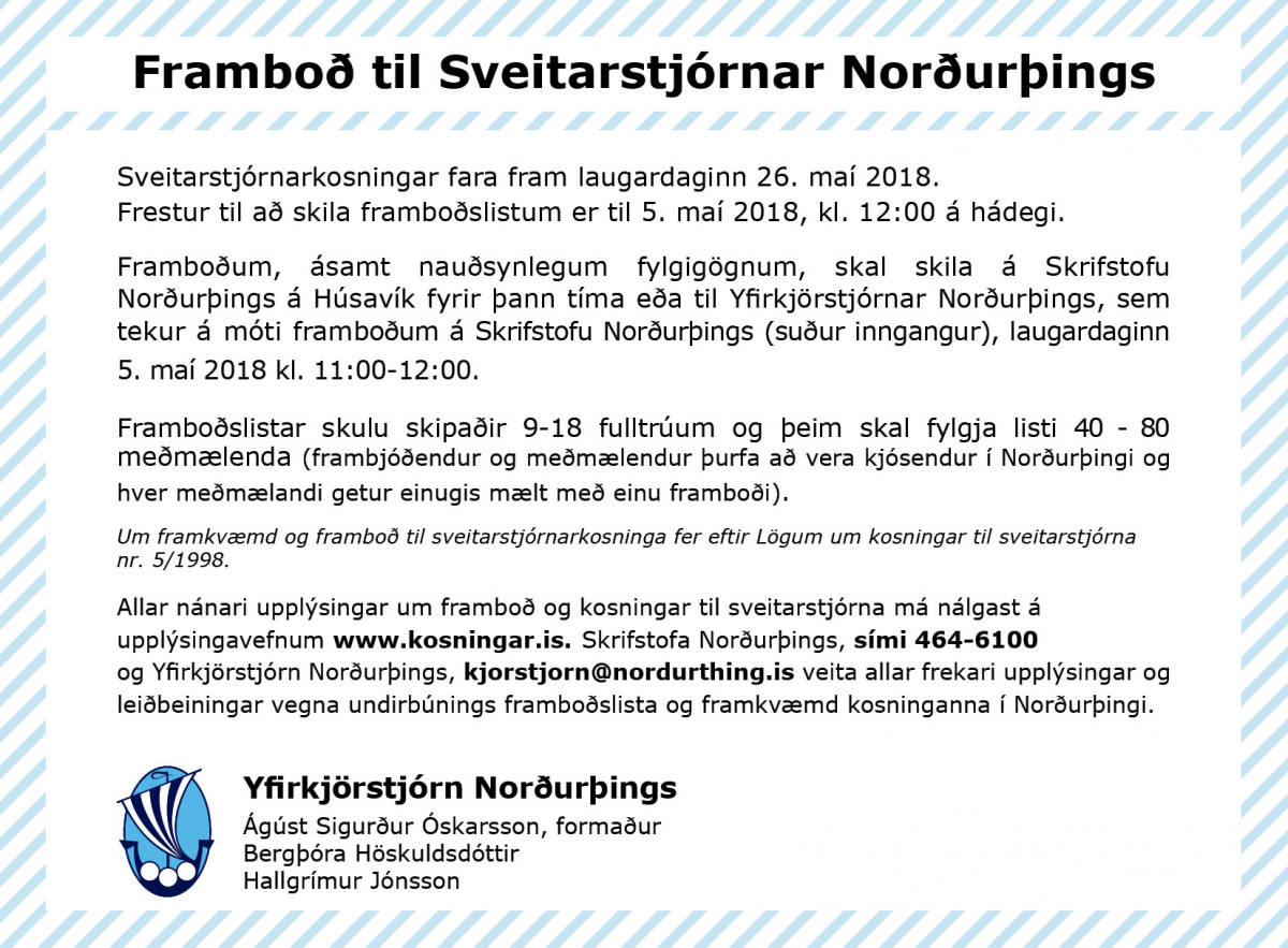 Framboðum, ásamt nauðsynlegum fylgigögnum, skal skila á Skrifstofu Norðurþings á Húsavík fyrir þann tíma eða til Yfirkjörstjórnar Norðurþings, sem tekur á móti framboðum á Skrifstofu Norðurþings (suður inngangur) laugardaginn 5. maí 2018 kl. 11:00-12:00.