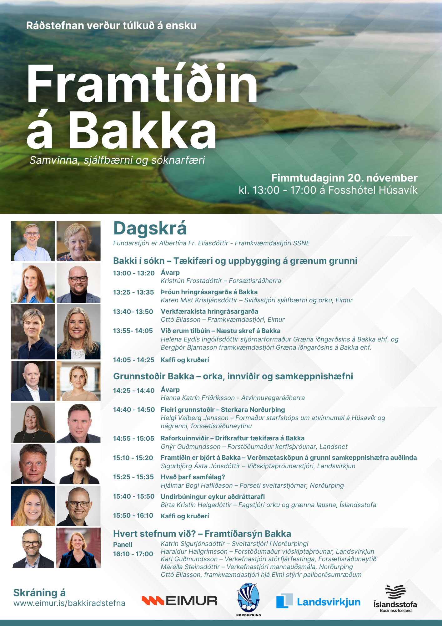Eimur, Norðurþing, Landsvirkjun og Íslandsstofa efna til opinnar ráðstefnu á Fosshótel Húsavík, fimmtudaginn 20. nóvember næstkomandi, þar sem sjónum er beint að framtíð Bakka við Húsavík sem miðstöð sjálfbærrar atvinnuuppbyggingar.