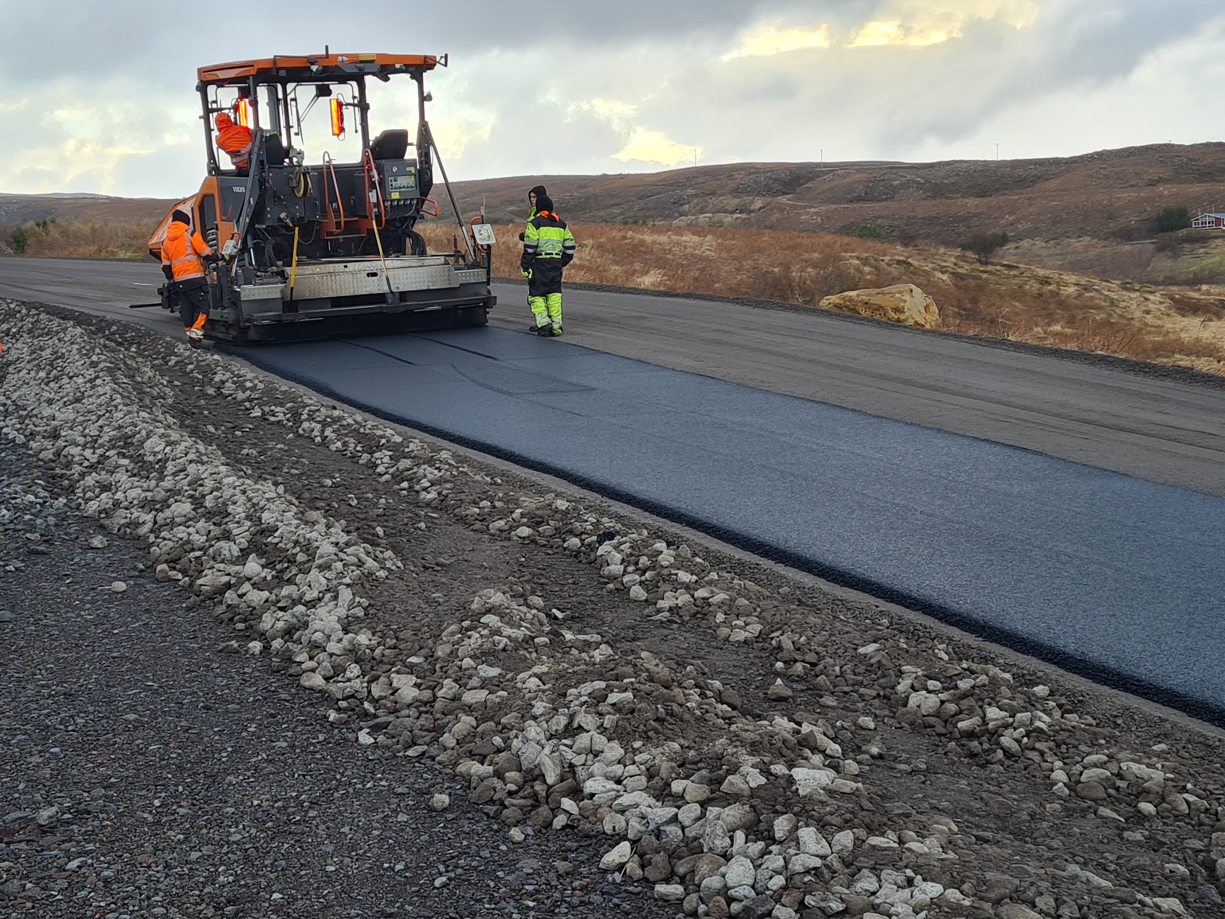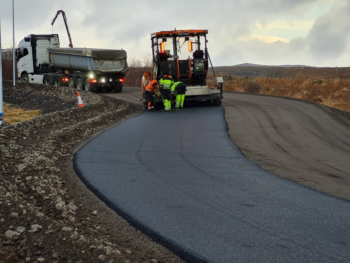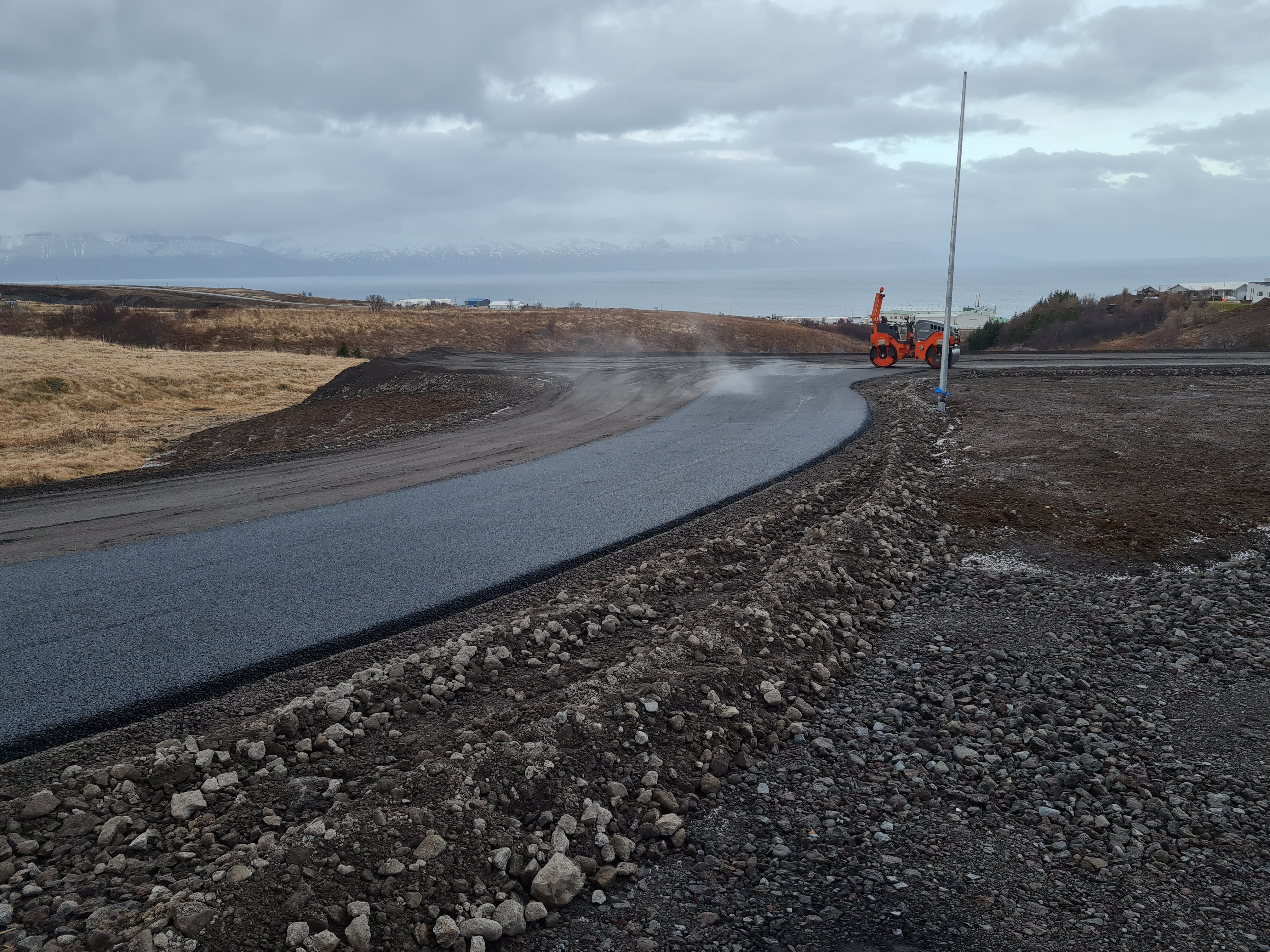 Í dag er unnið að malbikun á nýjum vegi upp að golfskála.