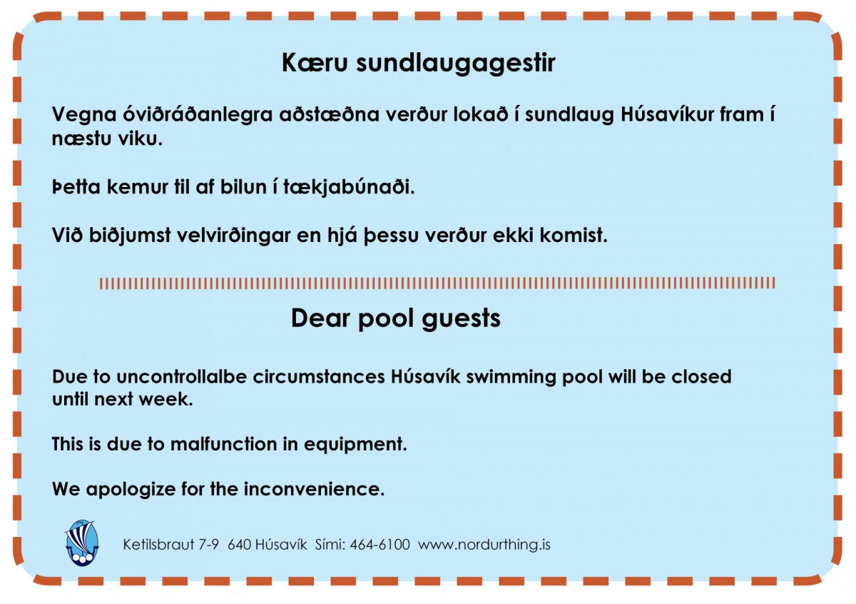 Vegna óviðráðanlegra aðstæðna verður lokað í sundlaug Húsavíkur næstu daga.
