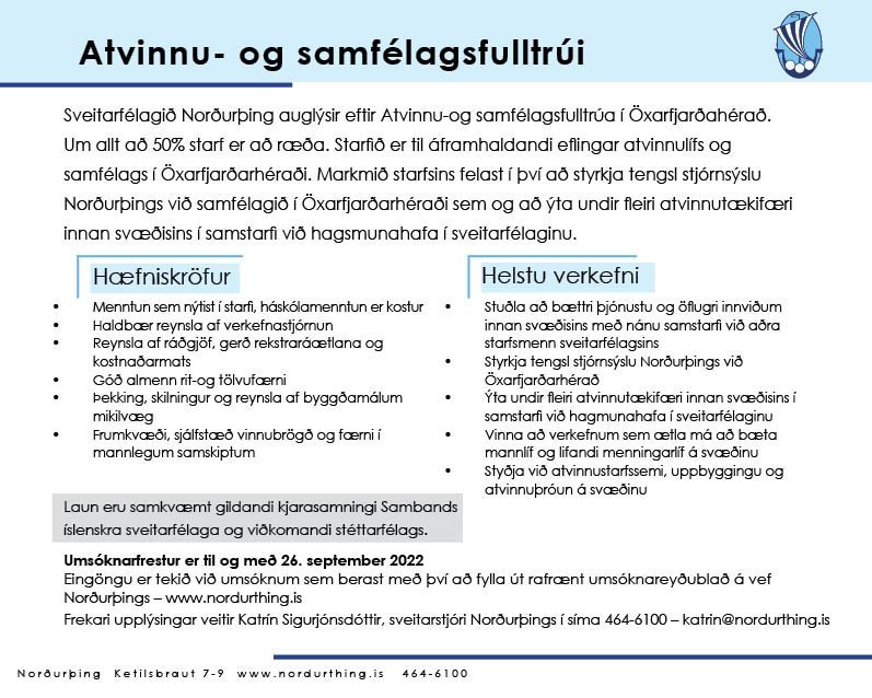 Sveitarfélagið Norðurþing auglýsir eftir Atvinnu- og samfélagsfulltrúa í Öxarfjarðarhérað.