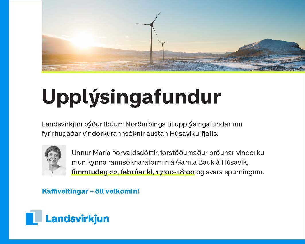 Fimmtudaginn 22. febrúar kl. 17:00 mun Landsvirkjun kynna fyrirhugaðar rannsóknir á upplýsingafundi á Gamla Bauk á Húsavík. Unnur María Þorvaldsdóttir, forstöðumaður þróunar vindorku hjá Landsvirkjun mun kynna rannsóknaráfromin og svara spurningum. Íbúar Norðurþings eru hvattir til að mæta á fundinn og kynna sér málið.