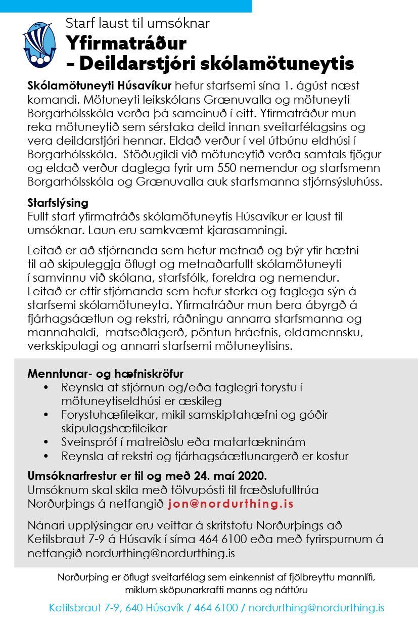 Fullt starf yfirmatráðs skólamötuneytis Húsavíkur er laust til umsóknar. Laun eru samkvæmt kjarasamningi.